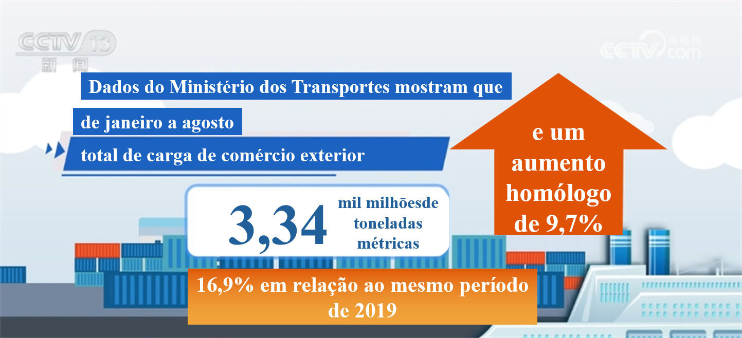 Dados do Ministério dos Transportes mostraram que, de janeiro a agosto, os portos do país movimentaram 3,34 bilhões de toneladas de carga de comércio exterior, um aumento de 9,7% em relação ao ano anterior e de 16,9% em relação ao mesmo período de 2019.